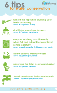 40 percent of household water use is flushing the toilet. Don’t use the toilet for anything other than human waste and toilet paper! And a running toilet can use as much as 200 gallons of water per hour, running your bill UP and the overall water supply DOWN. Replace any defective parts.