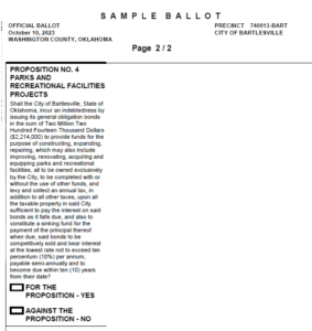 The City will hold its General Obligation Bond Election, commonly referred to “G.O. bond issue,” on Oct. 10, 2023. Registered voters who are eligible and who reside within the city limits of Bartlesville will be able to vote in this election. Please remember to bring identification such as a driver’s license or voter ID card.