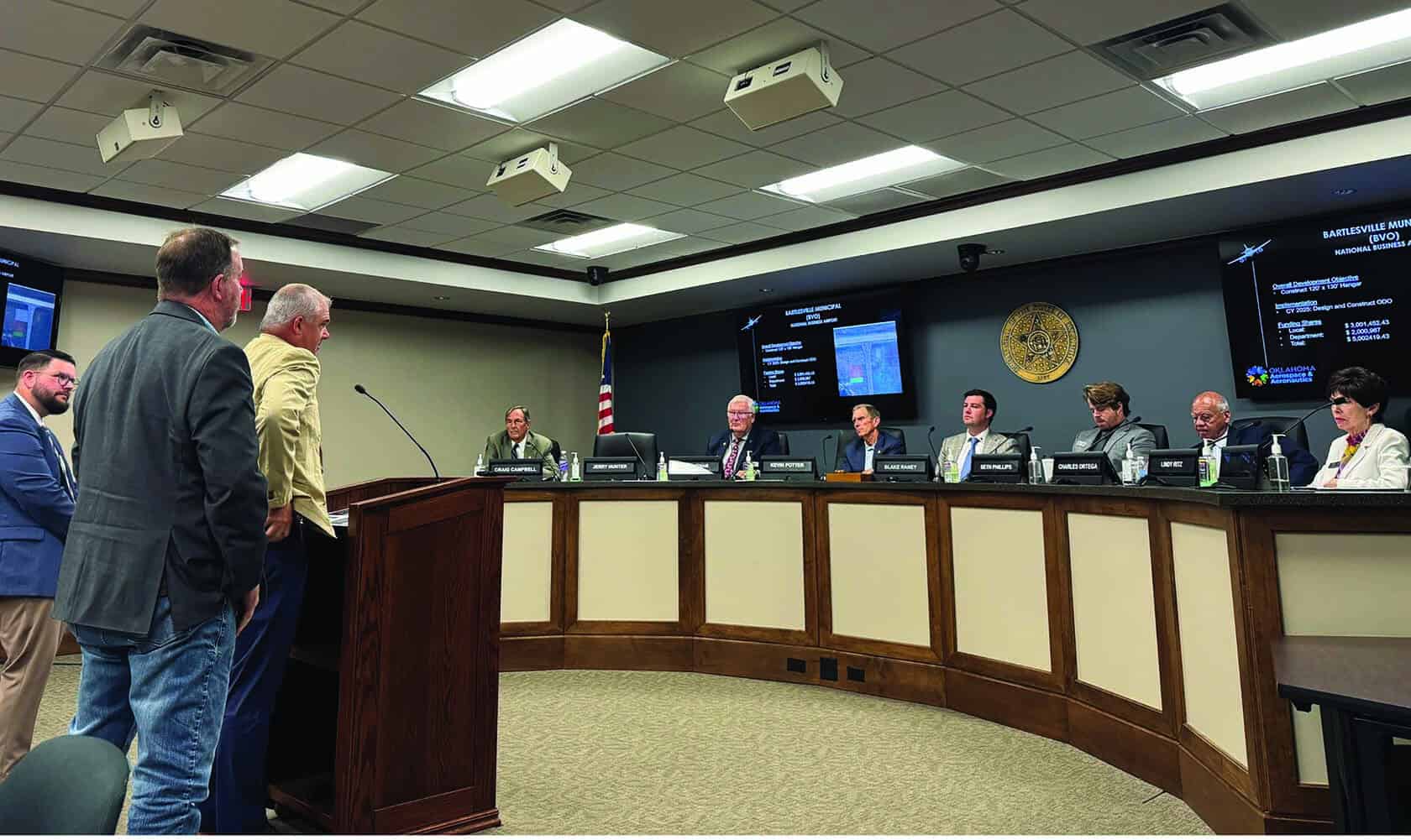 From left, Nick Young, the Airports Division Manager for the Oklahoma Department of Aerospace and Aeronautics, welcomed Mike Richardson, Airport Director for the City of Bartlesville, and Chris Batchelder, Vice President of Business Development for the Bartlesville Development Authority, to the meeting on July 9. The Oklahoma Aerospace and Aeronautics Commission granted $2.38 million towards a project for the construction of a 120-foot by 130-foot box hangar at the airport. Kevin Potter of Bartlesville, fifth from right, serves as vice-chair of the Commission. Photo courtesy of Oklahoma Department of Aerospace and Aeronautics