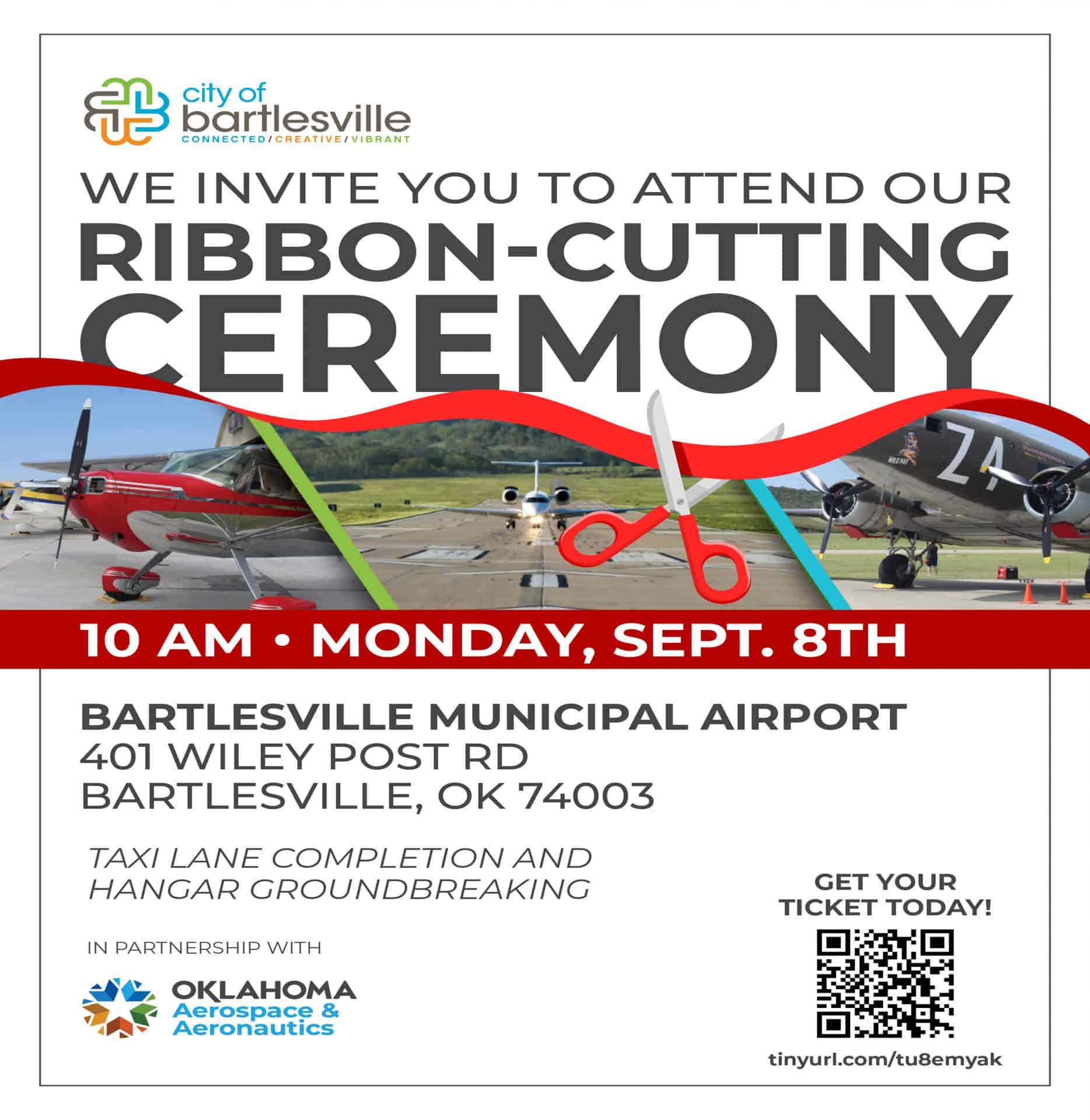 The event, co-hosted by the Oklahoma Department of Aerospace and Aeronautics and Bartlesville Development Authority, will celebrate the recently-completed $2-million taxilane project. Funds for the $2 million project came from a $1.18 million grant from the Oklahoma Department of Aerospace and Aeronautics, a $737,000 grant from the Federal Aviation Administration, and $101,306 from the City’s Airport Fund.