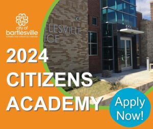 Applications for the City’s inaugural Citizens Academy will be accepted through March 1. The 2024 Citizens Academy is a free interactive program designed to familiarize the general public with the roles, services and operations that comprise Bartlesville city government.