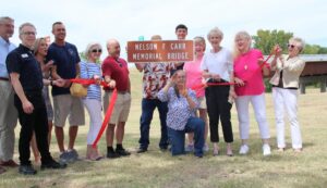 The Nelson F. Carr Memorial Bridge was dedicated on Monday afternoon with Carr family descendants and friends in attendance. Pictured with the family are Mayor Dale Copeland, far left, Ward 4 Councilor Quinn Schipper, second from left, local historian Debbie Neece, center kneeling, and State Sen. Julie Daniels, far right. The bridge, located on State Highway 123 near Delaware Avenue, crosses the Caney River not far from where Carr built his grist mill in 1870.
