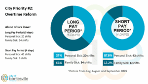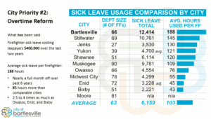 “Our firefighters have used an average of 188 hours of sick leave – nearly a full month off – over the past six years,” Kane said. “This is 85 hours more than the average in our universe (the 10 most comparable cities in Oklahoma.) It is two and a half to four times as much as their counterparts in Owasso, Enid and Bixby. Common sense dictates that firefighters in Owasso are not less prone to injury or illness performing the same job than firefighters in Bartlesville.”
