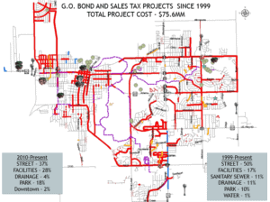 This graphic illustrates areas of Bartlesville where capital projects have been funded and completed since 1999. “Every effort is made to identify needs and complete these necessary projects in each area of our city,” said City Manager Mike Bailey. “City councils past and present have been mindful of this and have worked diligently to ensure equity across the community.”