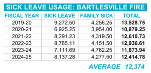 Kane gave two examples, saying two firefighters recently called in sick to attend a golf tournament and another who was observed working in his private lawn care business after calling in sick. He said in all, Bartlesville firefighters used 12,414 hours of sick leave last (fiscal) year.