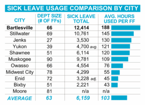 “That equates to 188 hours of sick leave for each firefighter, or nearly a month off,” he said. “That is by far the most of any department in (comparable cities) — nearly two and a half times what their counterparts in Owasso use. This means our firefighters are four times sicker than firefighters in Enid and Bixby. This chronic absenteeism drives the minimum manning issues that the department has faced, requiring force-backs that must be paid the most senior members of the department at double time.