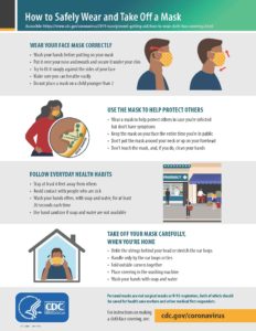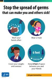 Wear a mask or face covering, wash your hands often with soap and water for at least 20 seconds, and practice social distancing. Stay at least six feet away from anyone who doesn’t live in your household. And get vaccinated when you can.
