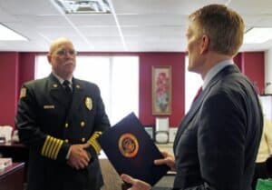 U.S. Sen. James Lankford (R-Okla.) presented Fire Chief David Topping with a letter and commemorative coin to recognize his retirement and years of service to the City of Bartlesville.