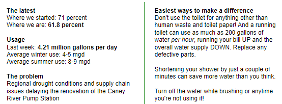 Some measures already implemented to reduce consumption include the City discontinuing water use for its fleet (with the exception of sanitation vehicles) and non-essential operational uses, altering watering of parks and golf courses, notification to wholesale customers, and public education.