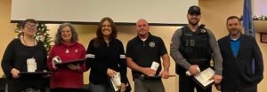 From left, Library Assistant Deborah Keim, History Museum Education Coordinator Betty Keim, Police Dispatcher Alison Morris, Police Sgt. Christopher Neal, and Police Sgt. Tyler Diedrich were honored for 10 years of service.