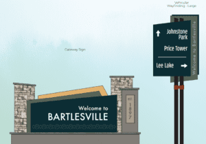 “For the wayfinding and gateway signs, we took a modern approach, but combined with a distinctly architectural flair,” she said. “Careful attention was focused on incorporating the use of layers and dimensions to highlight the depth found within Bartlesville. A quick glance will provide the important wayfinding information you need, but upon closer inspection, you will recognize the details inspired by Bartlesville’s beautiful sunsets or the downtown skyline.”