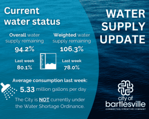 “The weekend rains have significantly improved our water supply. Hulah is at full capacity and in the flood stage, while Copan is still more than a foot short of being full, although inflow continues into the lake,” said Terry Lauritsen, Water Utilities director.