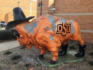 “The OSU buffalo was donated to the Bartlesville Public Library a couple of years ago,” McGill said. “Unfortunately, it was vandalized and the person who attempted to restore it used a material that did not stand up to the elements, so it is in bad shape.”
