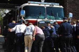 Bartlesville firefighters — with some help from City Councilors Paul Stuart and Jim Curd and City Manager Mike Bailey — “push” the fire department’s new pumper truck into service during a ceremony last week.
