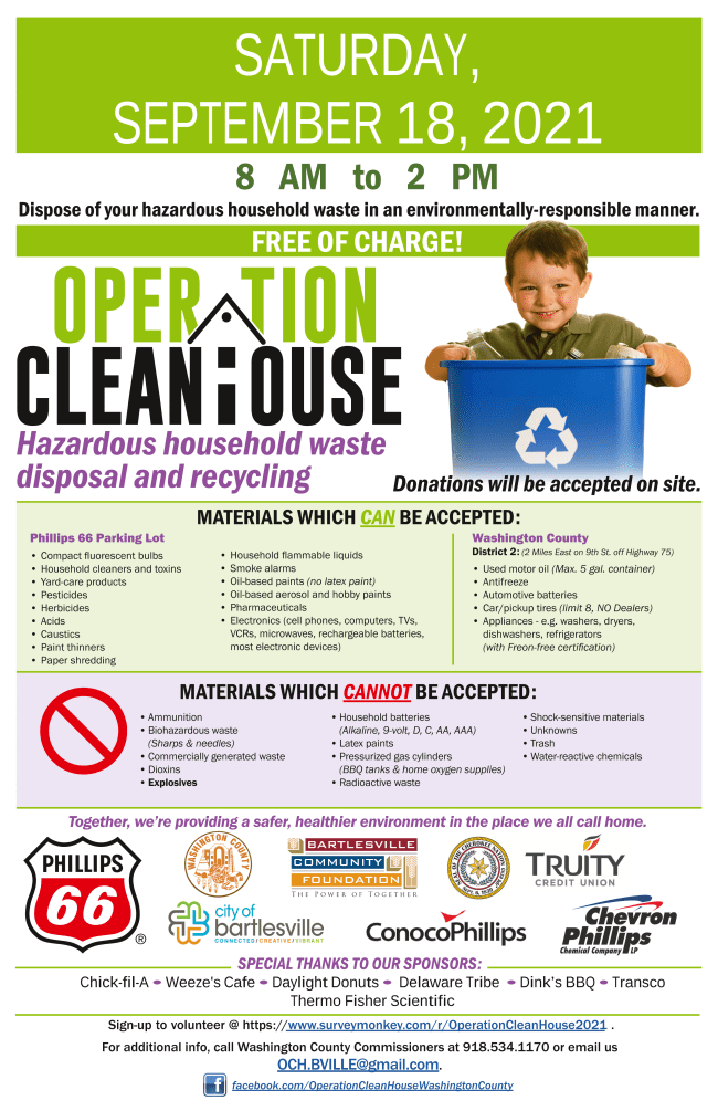 Operation Clean House is made possible thanks to several local organizations, including Phillips 66, ConocoPhillips, ChevronPhillips, City of Bartlesville, Washington County, Bartlesville Community Foundation, Truity, Cherokee Tribe, Chick-fil-A, Thermo Fisher Scientific, Delaware Tribe, Dink’s BBQ, Transco, and Daylight Donuts.