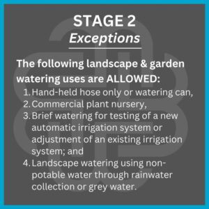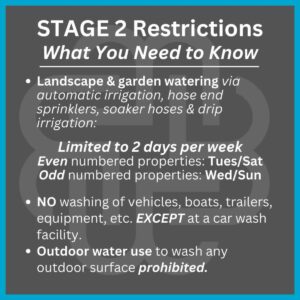 Under Stage 2 restrictions, landscape and garden watering through automatic irrigation systems, hose end sprinklers, soaker hoses and drip irrigation is restricted to two days per week. Even-numbered properties may water on Tuesdays and Saturdays, and odd-numbered properties may water on Wednesdays and Sundays.