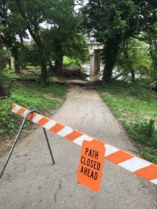 Several areas of Pathfinder Parkway, the City of Bartlesville-owned pedestrian path that winds through several Bartlesville neighborhoods, were closed recently due to flooding that began in May. One of those areas, near the Tuxedo Bridge, remains closed due to erosion — which was significantly worsened by the recent flooding.