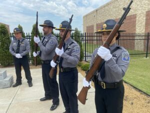 The Bartlesville Police Department Honor Guard prepares to execute a 21-Gun Salute during the annual Peace Officers Memorial Day ceremony on May 15.
