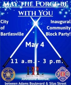 The Bartlesville Police Department is joining forces with the Bartlesville Fire Department and the Bartlesville Public Library for the City’s inaugural Community Block Party. “May The Force Be With You” will be held 11 a.m. to 3 p.m. on Saturday, May 4, on Johnstone Avenue between Adams Boulevard and Silas Street.