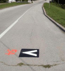 The 2-foot black square with the white chevron (or V) is used for LIDAR imaging, which, according to Wikipedia, is “a surveying method that measures distance to a target by illuminating that target with a pulsed laser light, and measuring the reflected pulses with a sensor. Differences in laser return times and wavelengths can then be used to make digital 3D-representations of the target.”