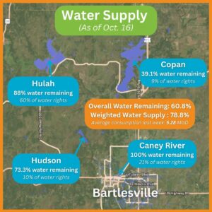 Bartlesville remains in Stage 2 of the Water Shortage Ordinance due to ongoing drought conditions and declining lake levels.