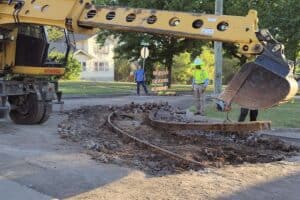 City Beat readers may recall that a nearly 75-foot section of the former Bartlesville Interurban Railway was uncovered during this street renovation. The Interurban operated more than 100 years ago on 10.1 miles of track connecting Dewey, Tuxedo, Bartlesville and the three smelters southwest of town. For more information, see City preserves portion of 100-year-old Interurban Railway.